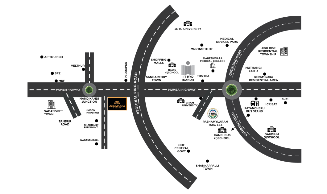 Welcome to Annapurna County, where your dream of owning a premier residential or commercial open plot becomes a reality. Sprawling across an expansive 32 acres, this remarkable development is strategically positioned on the Mumbai-Hyderabad National Highway and is adorned with DTCP and RERA approvals. Designed to offer exceptional living and investment opportunities, Annapurna County ensures unmatched connectivity, proximity to urban centers, and high returns on investment.